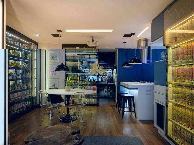 Cozinha estilo americana. Fogão cooktop, armários planejados, área de serviço e varanda integrada