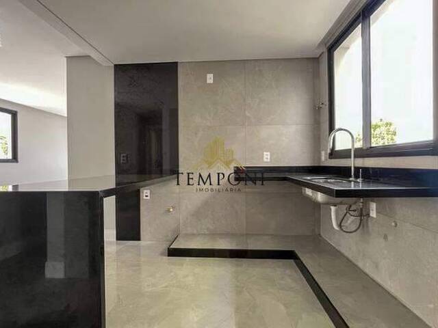 Cozinha é ampla e funcional com piso e parede em porcelanato, bancada americana e pia em granito preto