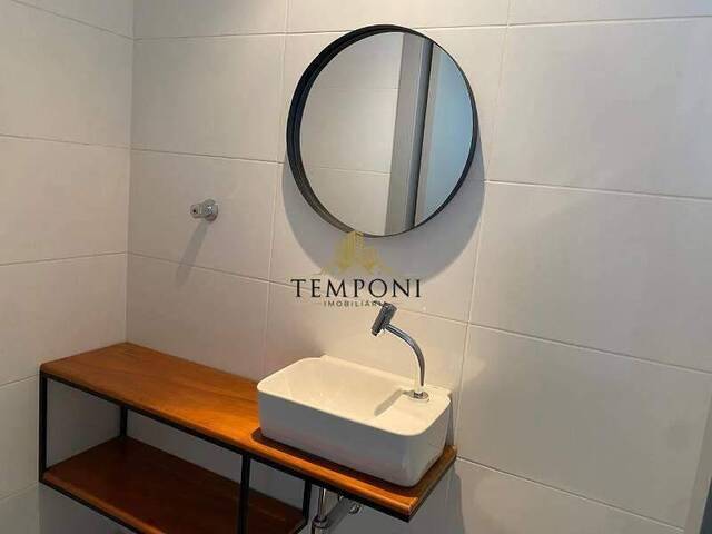 Banheiro social com armário, espelho e box em blindex;